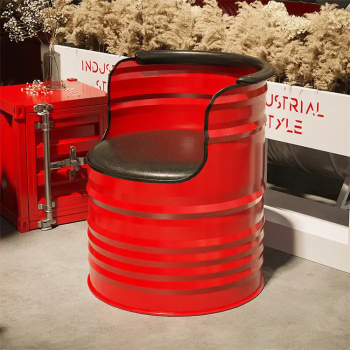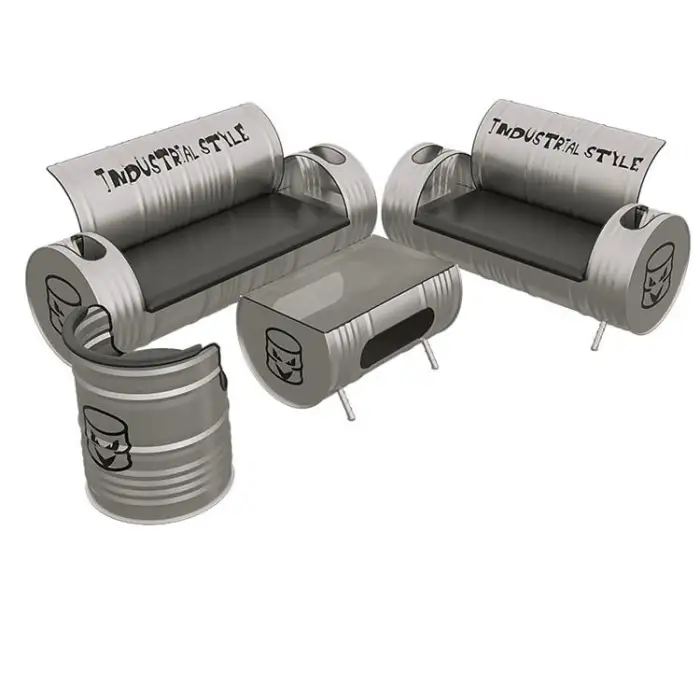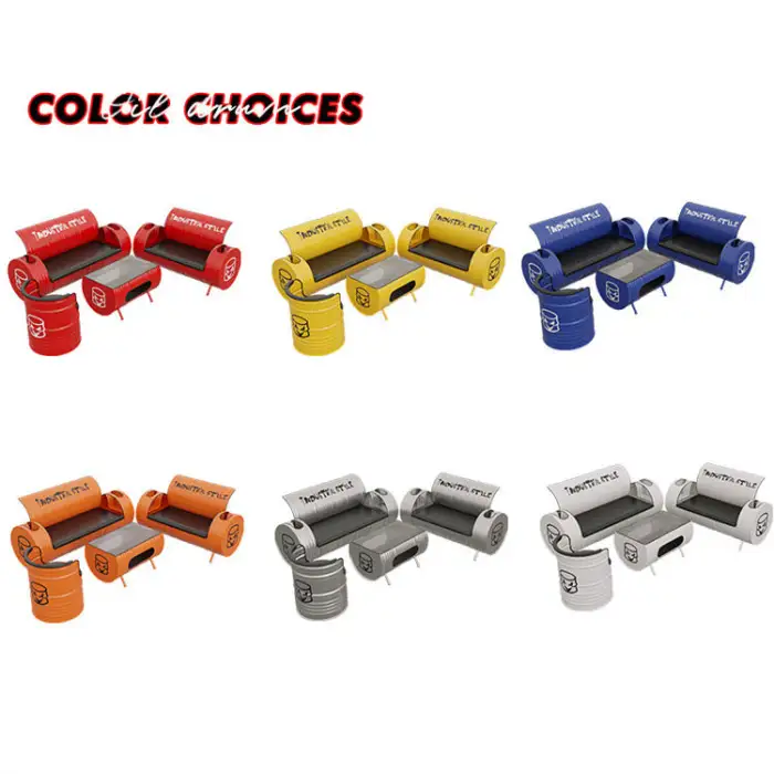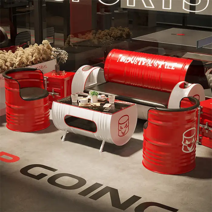 The table and chairs are made from durable oil drum metal, ensuring both strength and a modern industrial appearance.