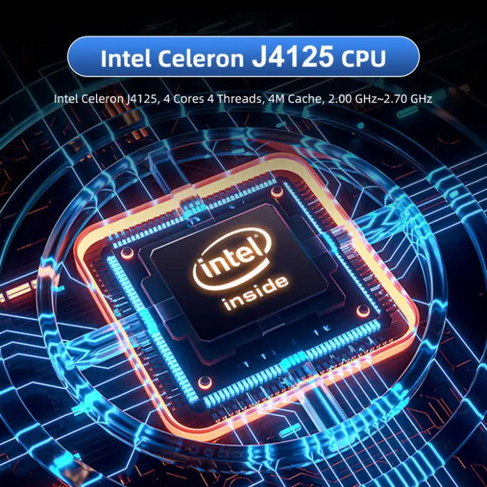 The mini PC is powered by an Intel Celeron J4125 CPU, which has 4 cores and 4 threads, with a clock speed ranging from 2.00 GHz to 2.70 GHz.