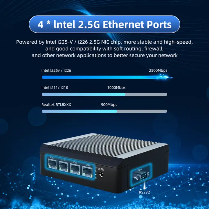 The mini PC is equipped with 4 x Intel I225V / I226 2.5G network card LAN ports.