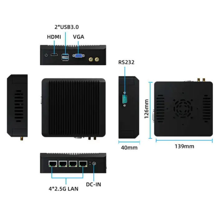 The dimensions of the mini PC are 139 x 126 x 40 mm.