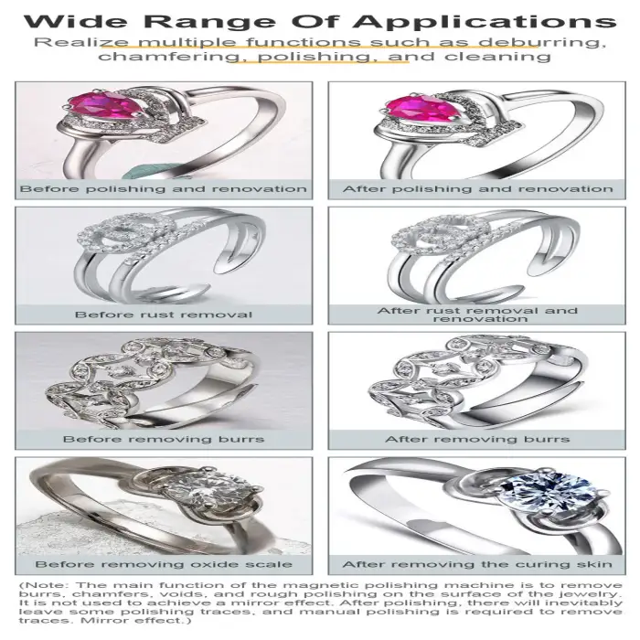 The machine uses a speed-controlled polishing process that effectively cleans and restores the shine of various jewelry pieces.