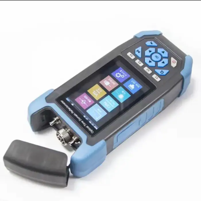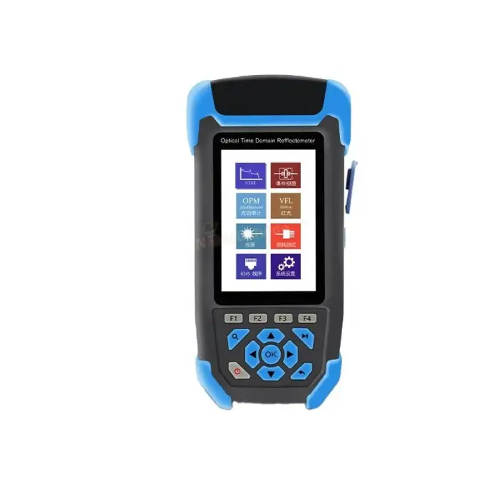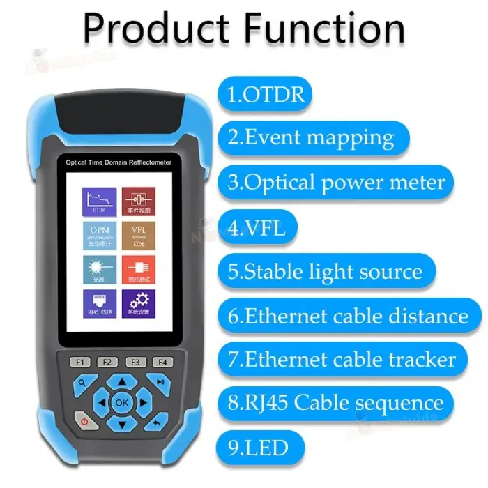 Key features include high precision testing analysis, a multi-functional 9-in-1 design with OPM (Optical Power Meter), VFL (Visual Fault Locator), and OTDR capabilities.