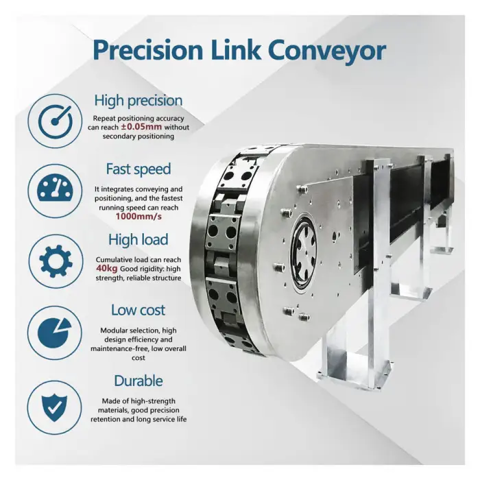 This conveyor is ideal for automated production lines, electronic digital assembly processes, and any setting requiring precise and rapid item movement.
