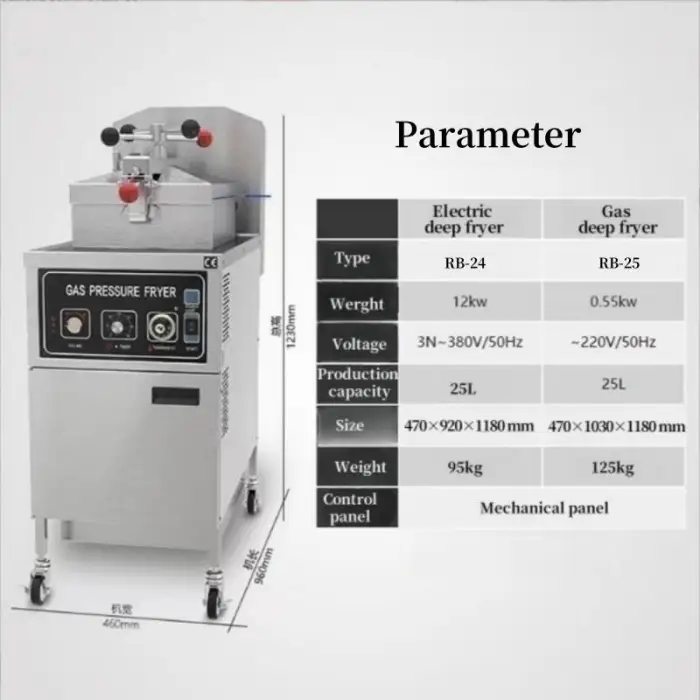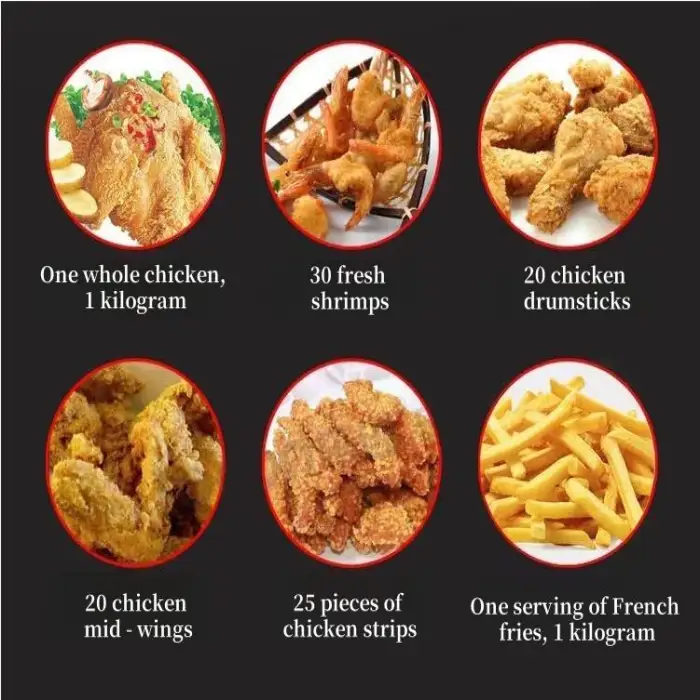 The machine has a capacity of 24L, which can accommodate 4 to 6 whole chickens or a large amount of French fries.