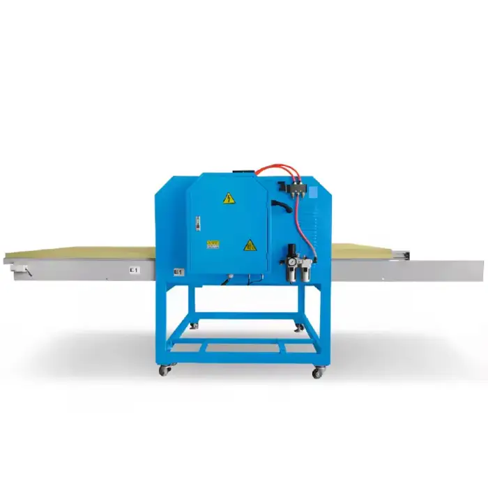 The machine uses pneumatic operation to apply consistent pressure, ensuring even heat distribution and high-quality prints.