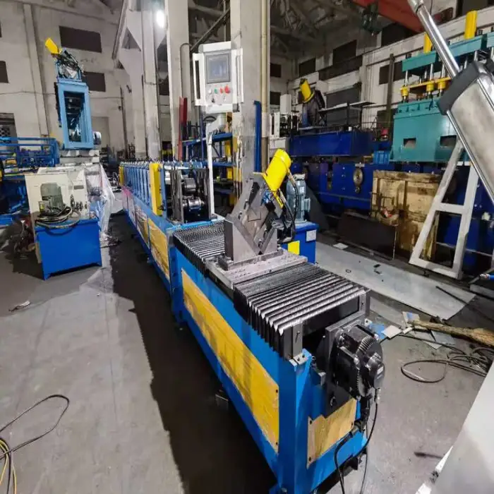 The machine features a hydraulic decoiler that facilitates the unwinding of the steel material for smooth feeding into the forming process.