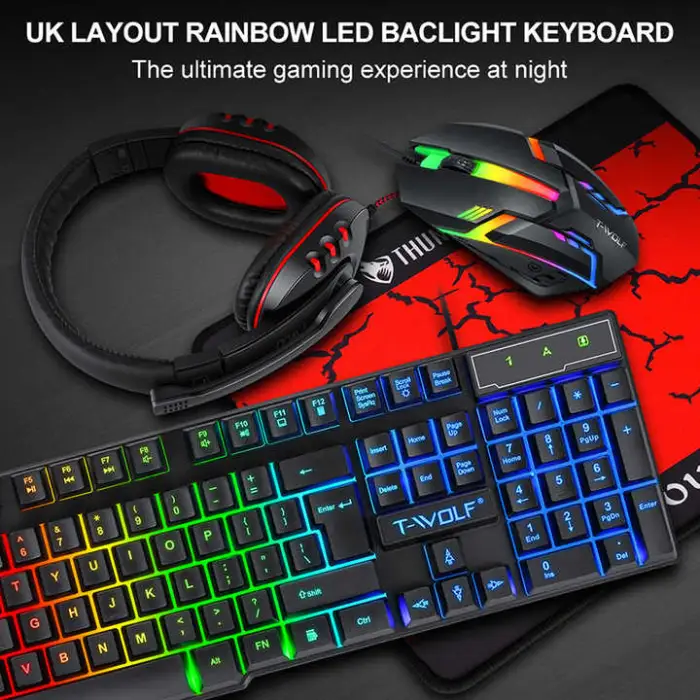 The LIVOLF TF-800 Keyboard Mouse Set includes a keyboard, a mouse, and a headset, making it a complete four-piece gaming and office solution.
