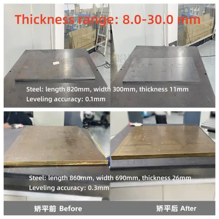 The Mahat High Precision Leveling Machine is designed to handle steel sheets with a thickness range of 8-30 mm.