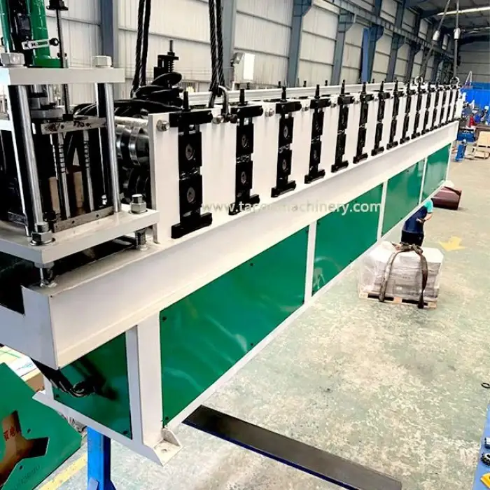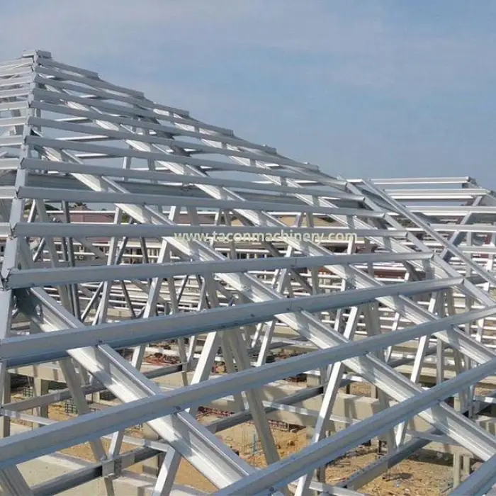 The machine is designed to manufacture building materials such as steel frames, purlins, and omega hat channels.