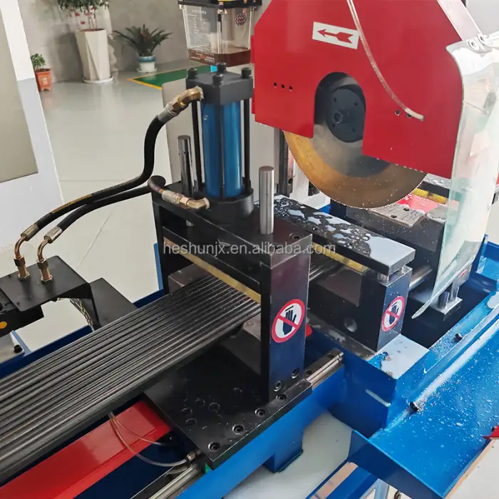 This machine is designed to cut various metal materials, including pipes and profiles used in manufacturing.