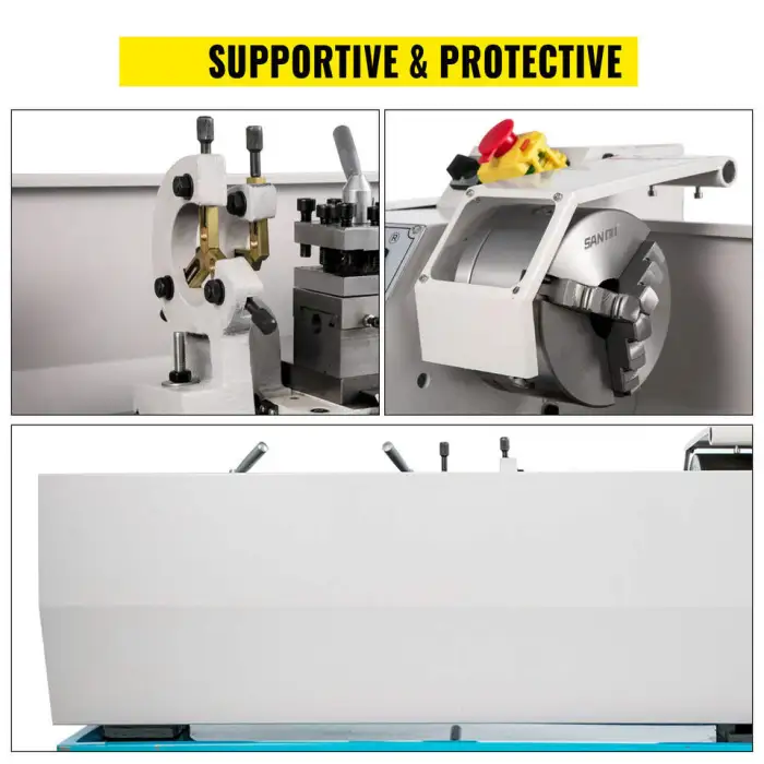 This machine is suitable for turning both metal and wood, making it versatile for various machining tasks.