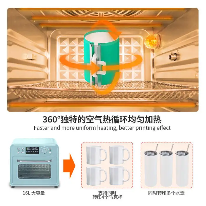 The Mini Sublimation Oven has a capacity of 16 liters, allowing you to handle both 11oz and 20oz mugs.