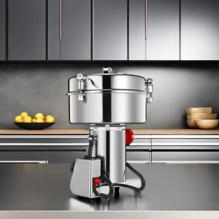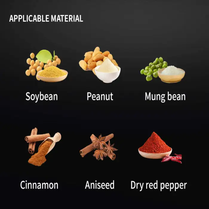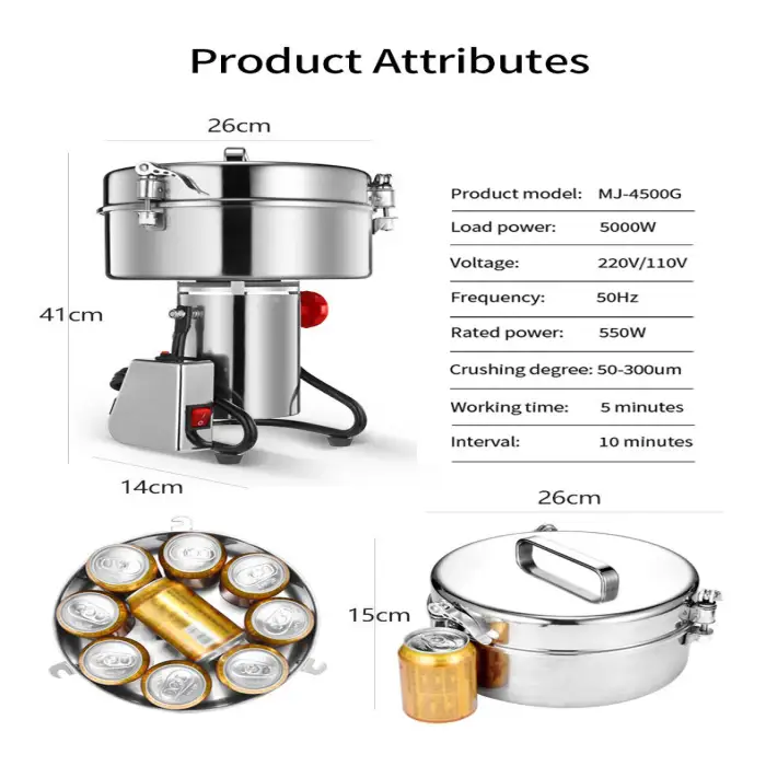 The MJ 4500G can grind various dry powders including rice, corn, cocoa, soybean, coffee, spices, herbs, and sesame.