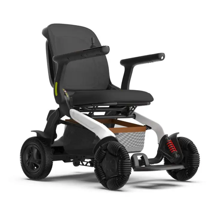 The wheelchair is available in three stylish colors: White, Green, and Grey.