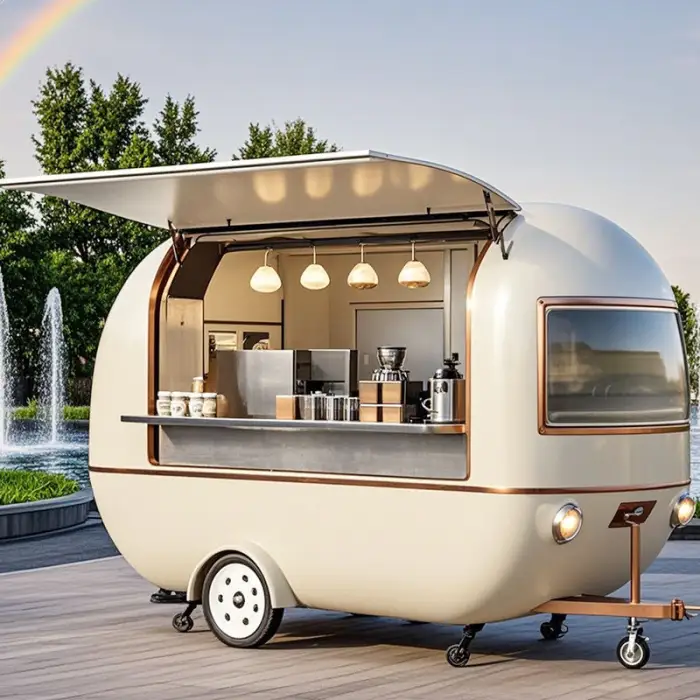 The trailer is constructed from food-grade stainless steel, ensuring durability and safety for food preparation.