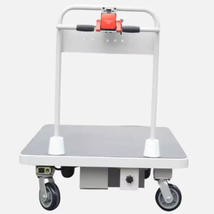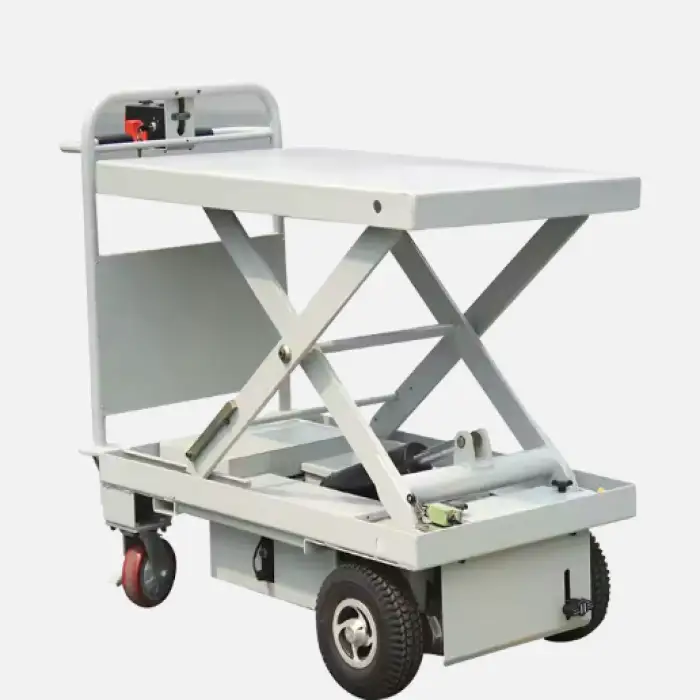 The trolley operates electrically, which allows for easy lifting and moving without manual effort.