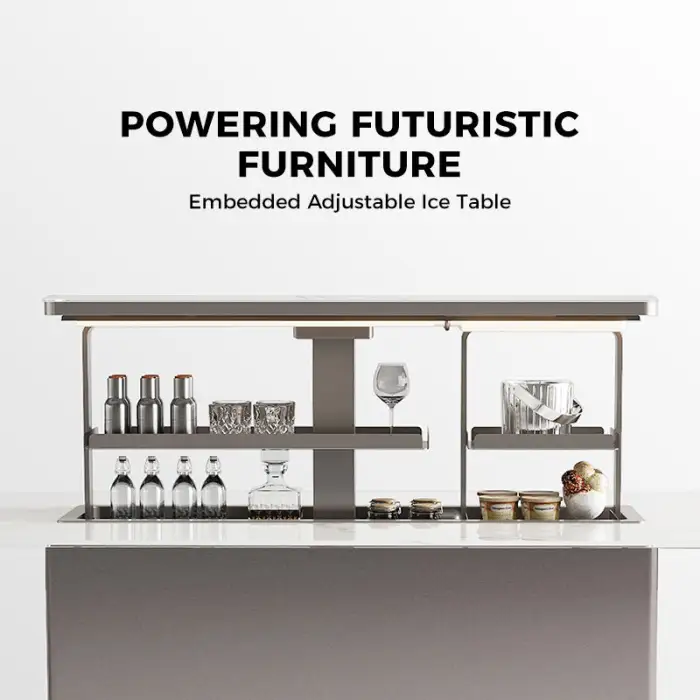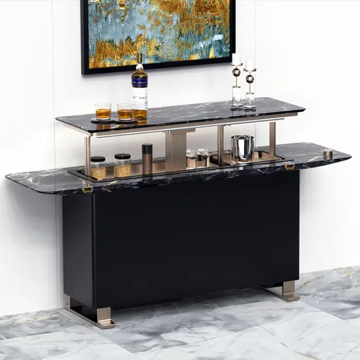 Key features include a modern design, multi-functional use as a dining table and wine cabinet, customizable colors, adjustable height, and spacious storage.