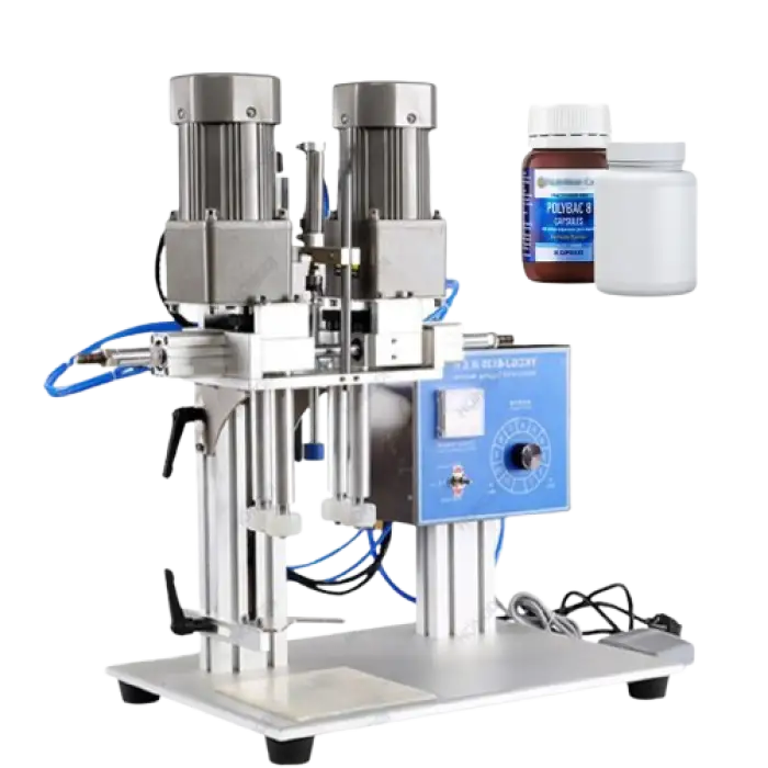 The Multifunctional Small Bottle Cap Capping Machine is suitable for various bottle sizes and can be used with metal, glass, and plastic containers.