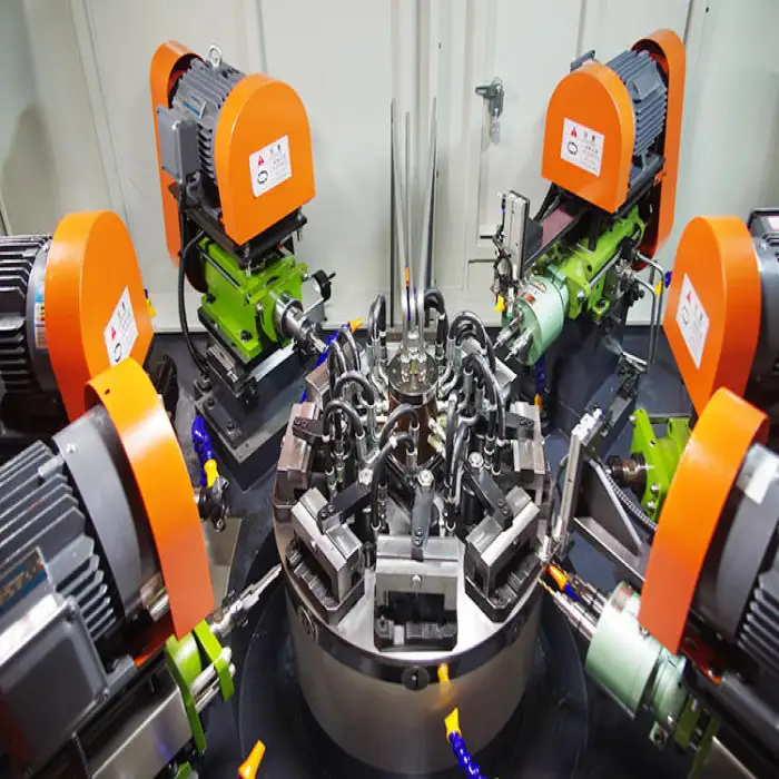 Key features include a six-spindle rotary plate for efficiency, a combined multi-station and multi-spindle design, and robust construction for durability.