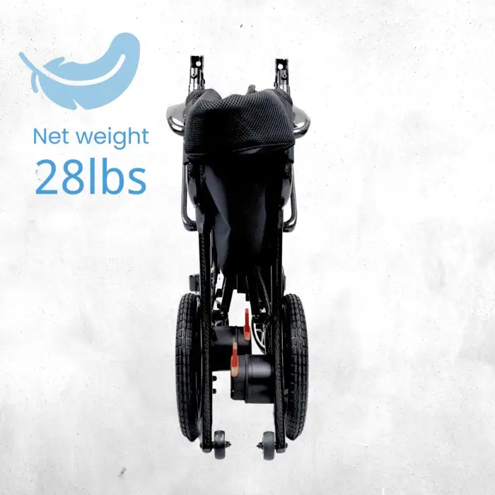 The net weight of the MUNIU Carbon Fiber Electric Wheelchair is 13 kg with the 10 Ah Lithium battery.