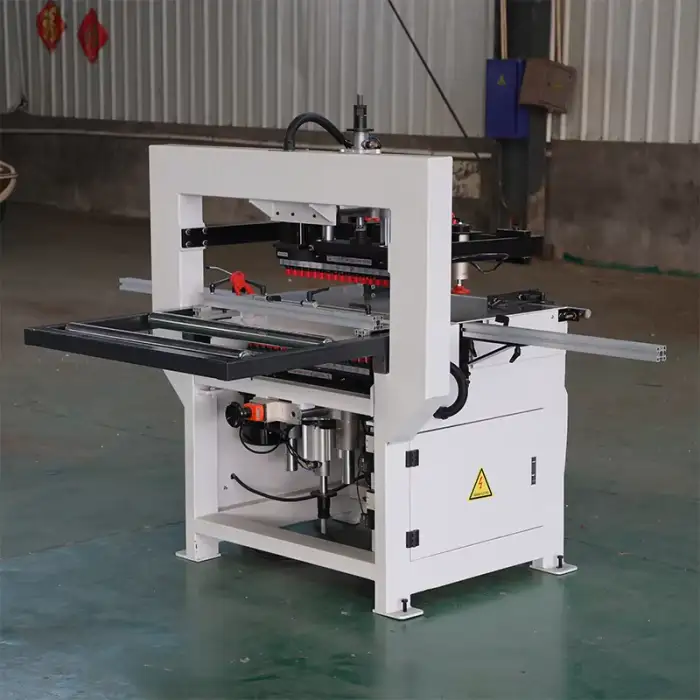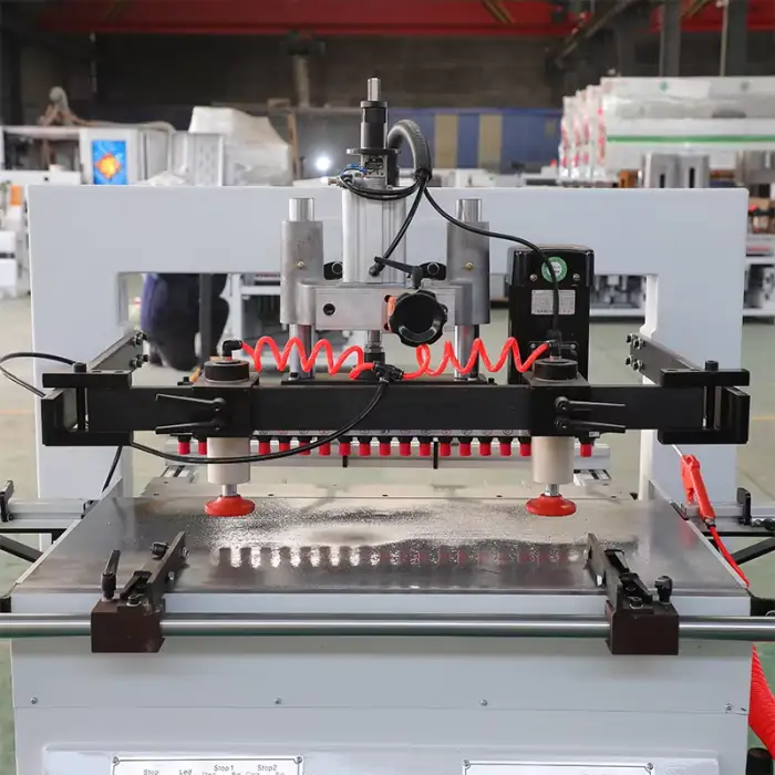 Key features include double rows for efficient drilling, a multi spindle design for simultaneous drilling, a robust control system, high power output, and compact dimensions for easy placement.