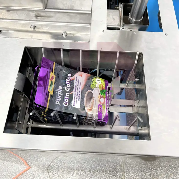 The machine is suitable for packing stand-up pouches and bags made from plastic and paper materials.