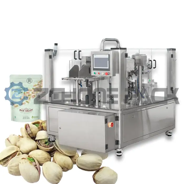 Nut Packaging Machine Food Snacks Stand-Up Pouches Open Zipper Automatic Discharging Sealing Filling
