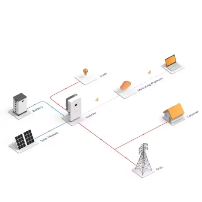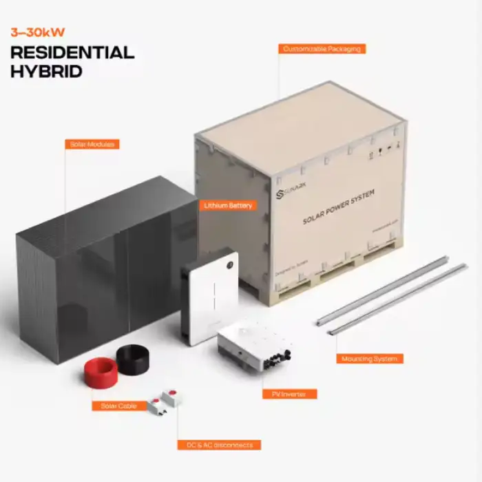 The system is equipped with a hybrid inverter with a power range from 3Kw to 30Kw, allowing for flexible energy management.