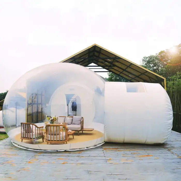 The tent is available in white and clear colors, with options for custom colors.