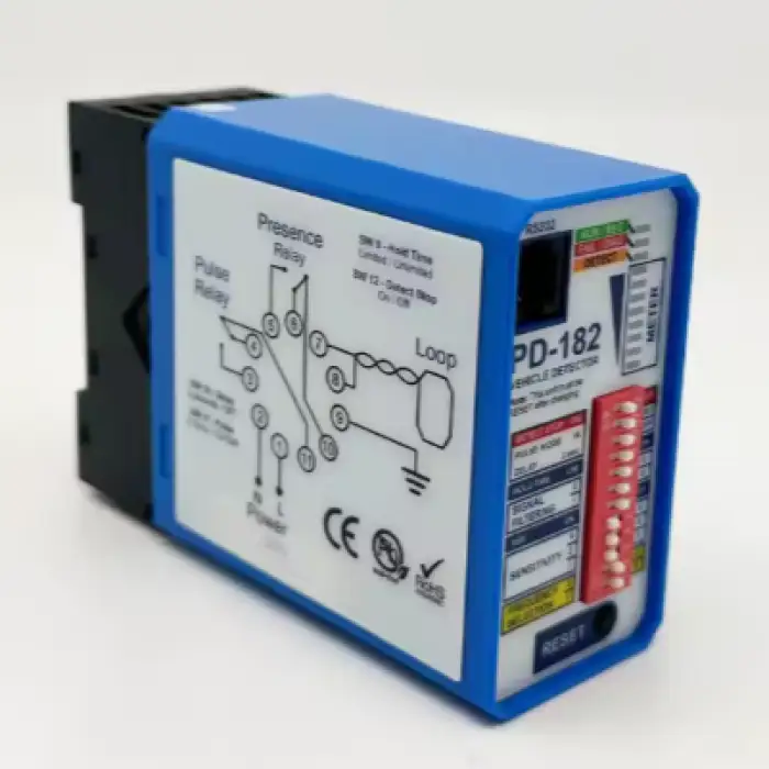 The PD182 detects vehicles using inductive loop technology, which senses changes in the inductance caused by the presence of a vehicle over the loop.