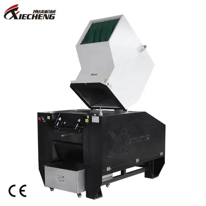 The machine is designed to efficiently crush PVC, PP, PC, and PS plastics.