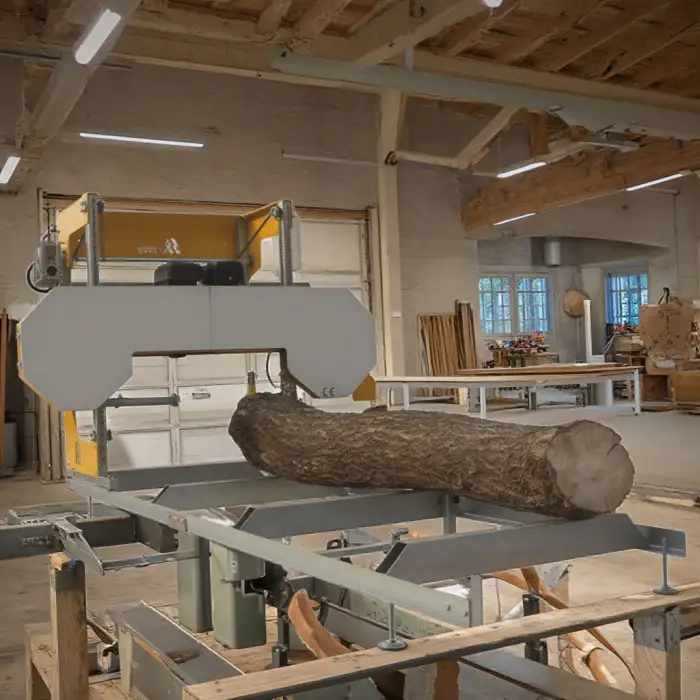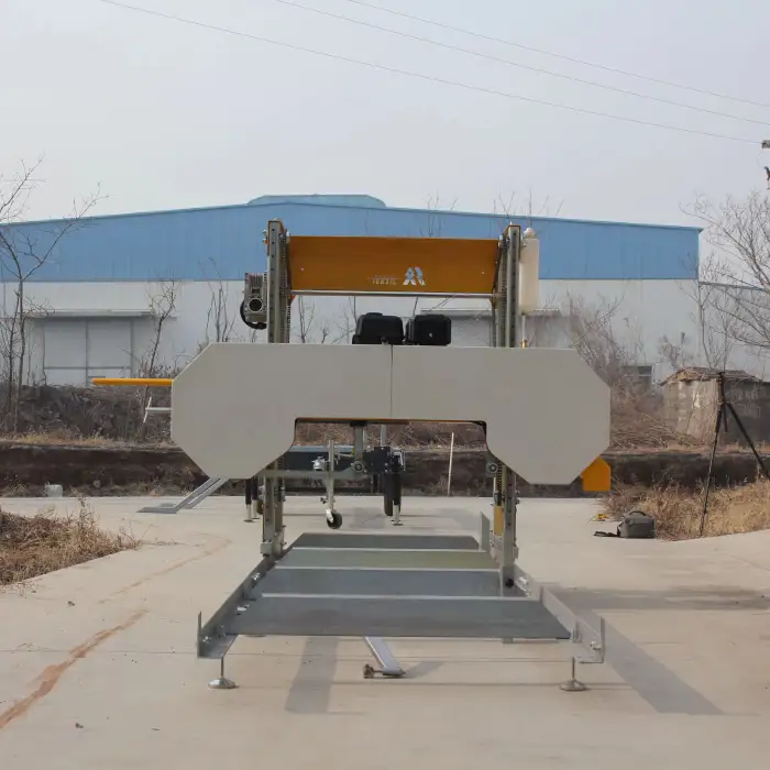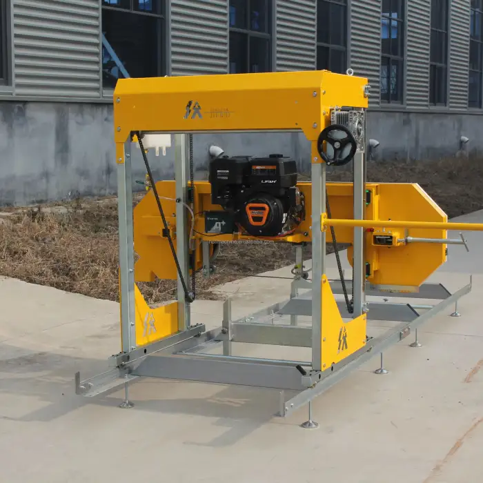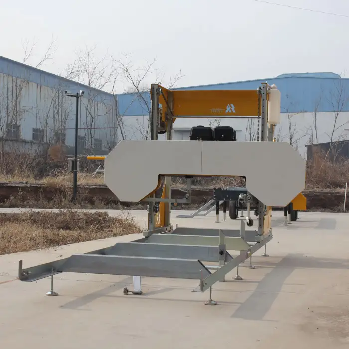 The Petrol Engine Sawmill Band Saw is powered by a petrol engine, providing the necessary power for efficient wood cutting.