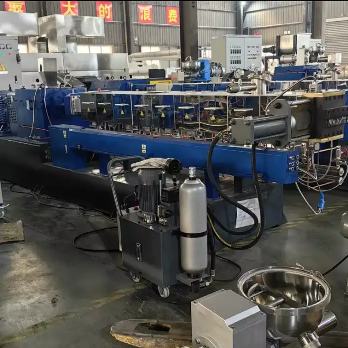 The machine features a double-screw design, which enhances mixing and processing efficiency.