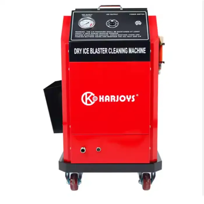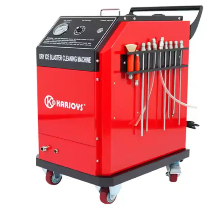A dry ice blasting machine uses dry ice pellets as a cleaning agent to remove dirt, grease, and contaminants from various surfaces without leaving any residue.