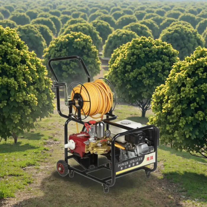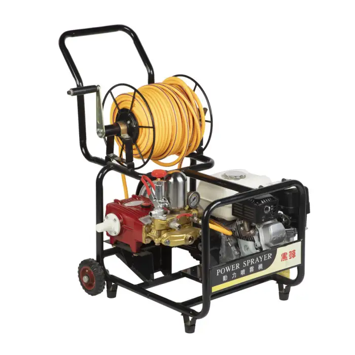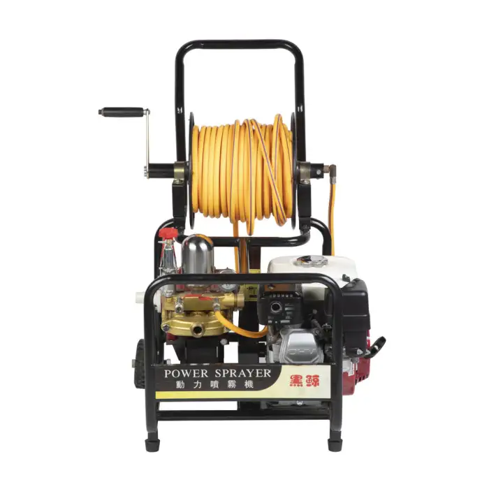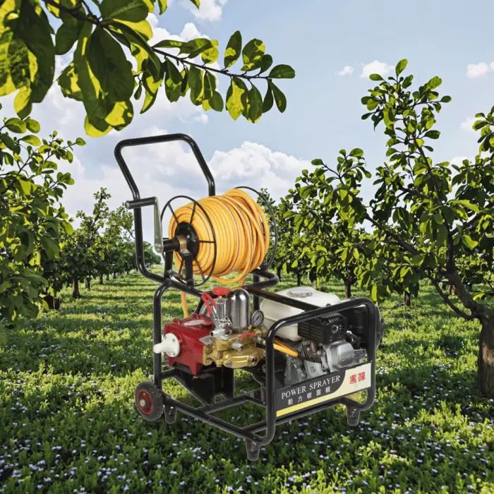 This sprayer operates using a gasoline engine, providing high-pressure spraying for effective pesticide application.
