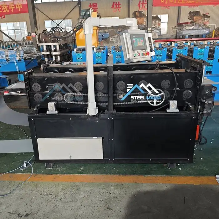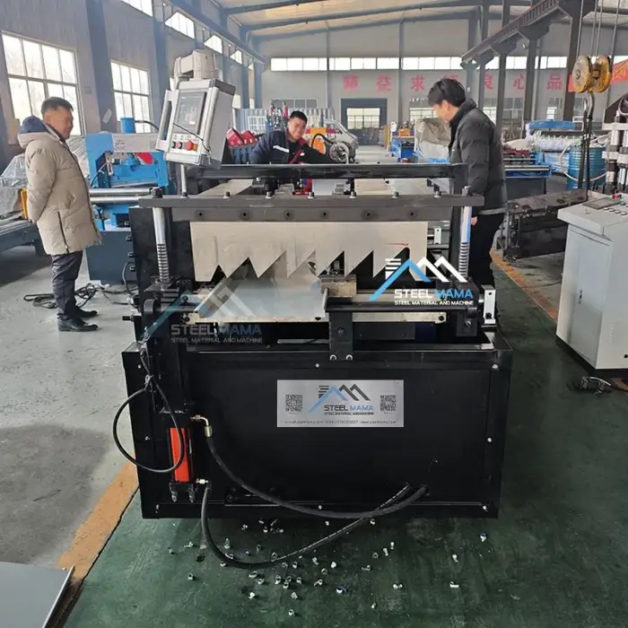 The machine utilizes hydraulic cutting for precise and clean cuts, ensuring high-quality roofing sheets.