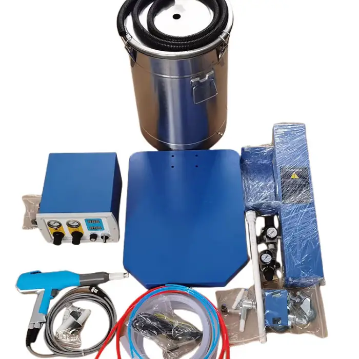 Key features include high productivity for various coatings, efficient electrostatic spray technology, compact size for easy handling, durable construction, and user-friendly controls.