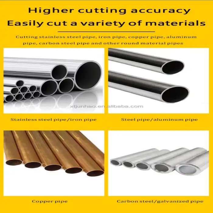 The machine is designed to cut various materials, including carbon steel, stainless steel, PVC, plastic, and aluminum.