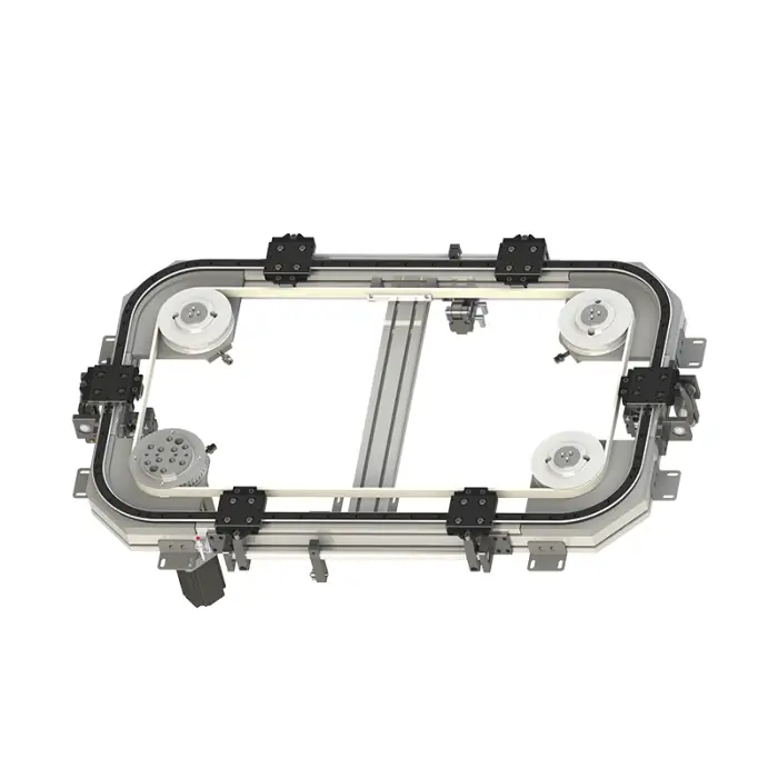 The conveyor uses a synchronous belt drive system, which ensures smooth and reliable operation.