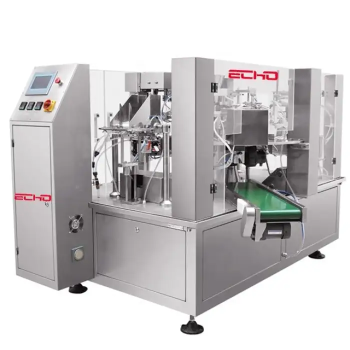 The Echo Machinery Packing Machine is designed to work with premade laminated film bags, suitable for various materials including plastic and paper.