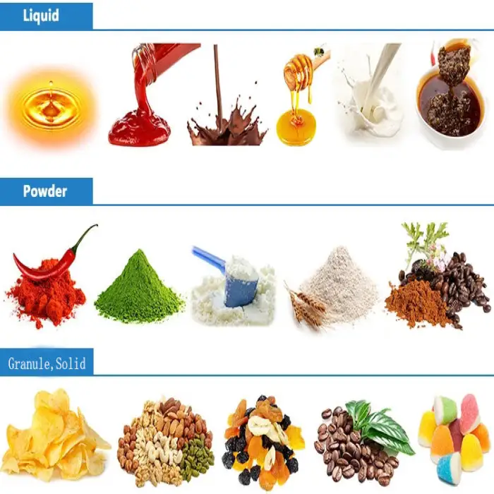 The machine is suitable for packaging a variety of materials, including food items, beverages, and even chemical products.