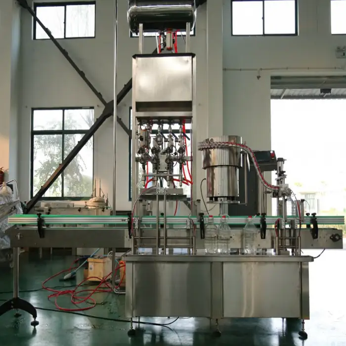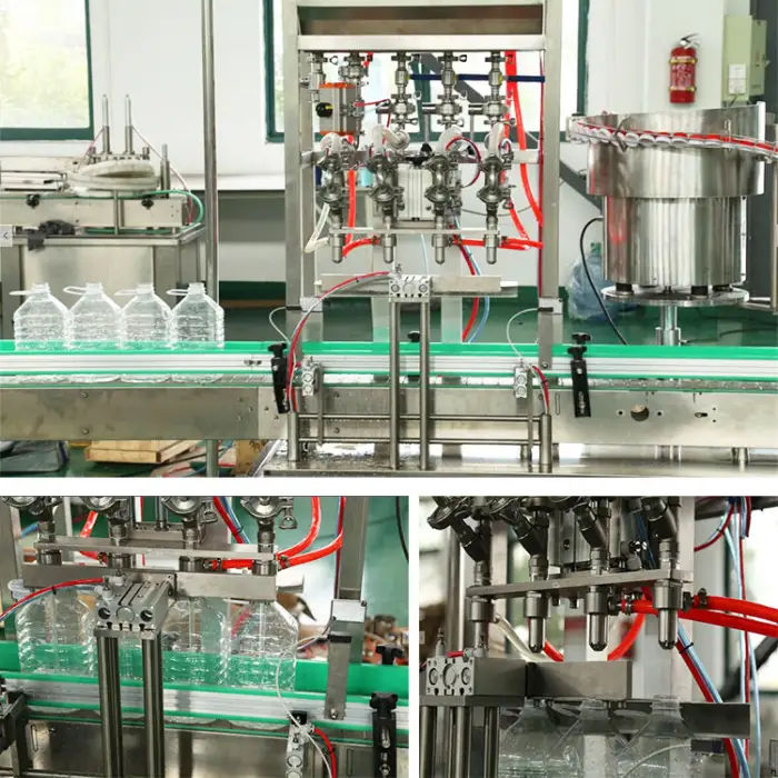 The machine is capable of filling a variety of liquids, including beverages like juices and sodas, pure water, milk, oils, and chemicals.