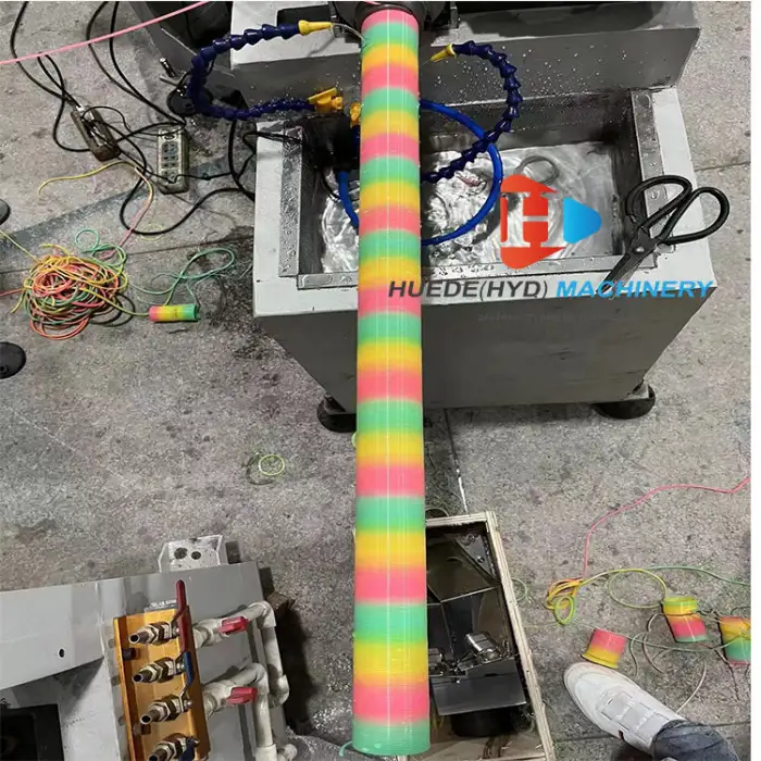The Rainbow Circle Toy Making Machine can create colorful spring coils that can be used for various crafts and designs.