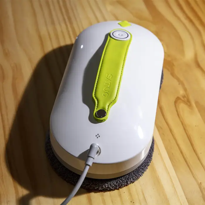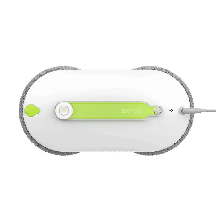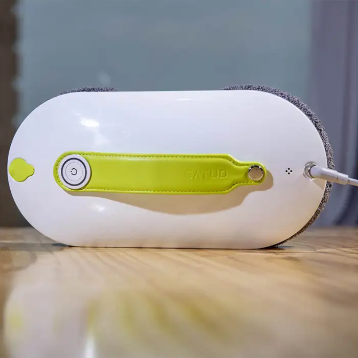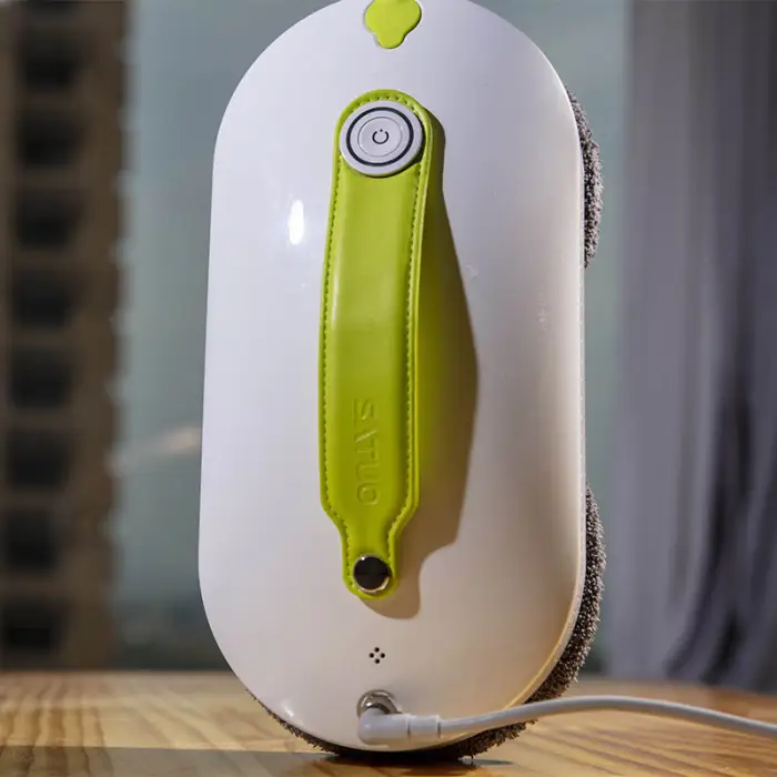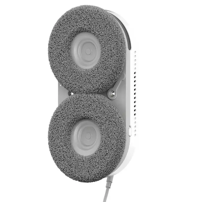 The robot cleaner uses a combination of remote control and mobile app operation to clean windows. It sprays water on both sides and employs a double wheel direct friction method for effective cleaning.