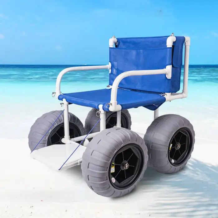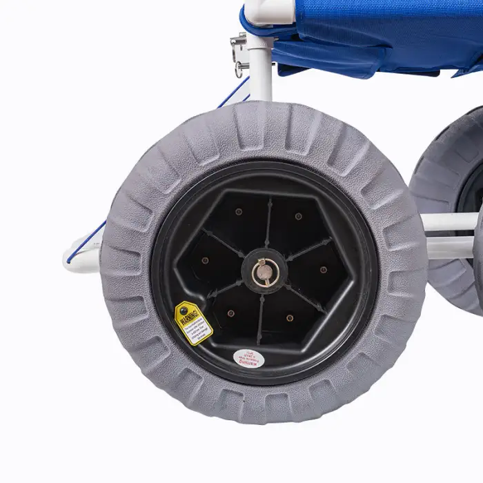 The Sand Beach Chair is equipped with 16-inch wheels for both the front and rear, designed to navigate sandy environments easily.
