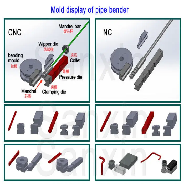 The Sanxin Pipe Bender can process various materials including alloy, brass, copper, carbon steel, stainless steel, and aluminum.