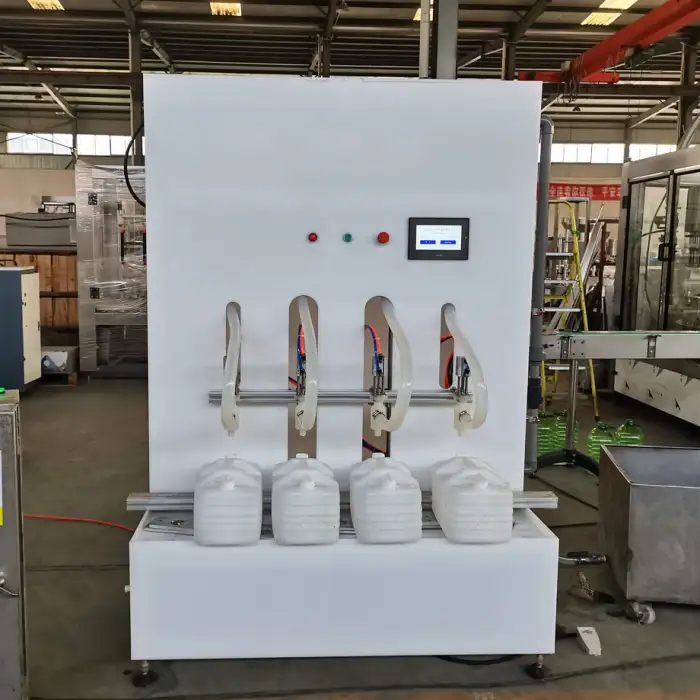 The Semi Automatic Four Head Chemical Detergent Bleach Liquid Filling Machine can handle various liquids including chemical detergents, bleaches, beverages, and water.