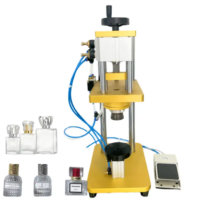 The machine is designed for efficiently capping perfume bottles, ensuring that each bottle is securely sealed to preserve the quality of the product.