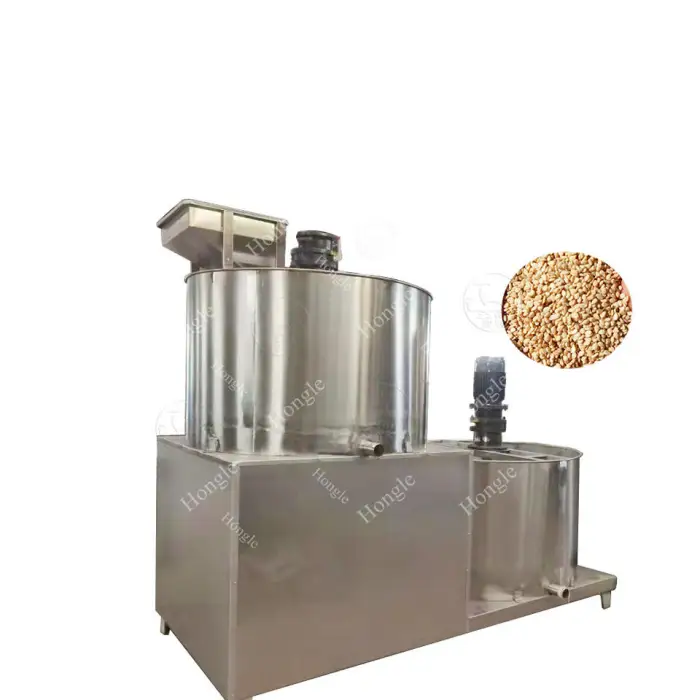 The machine efficiently cleans and peels sesame seeds through a combination of washing, separating, and peeling mechanisms.