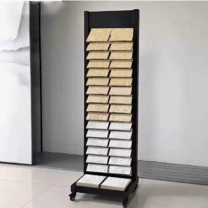 This display rack is ideal for stone showrooms, retail stores, trade shows, interior design shops, and construction sites.